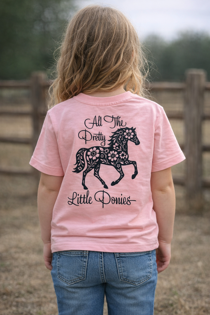 Sweet, fun, and full of country charm — Dusty Diamonds All The Pretty Little Ponies tee is made for little cowgirls who love a bit of western flair. Featuring a beautiful floral pony design with soft dusty pink tones, this shirt is as cute as it is comfortable.