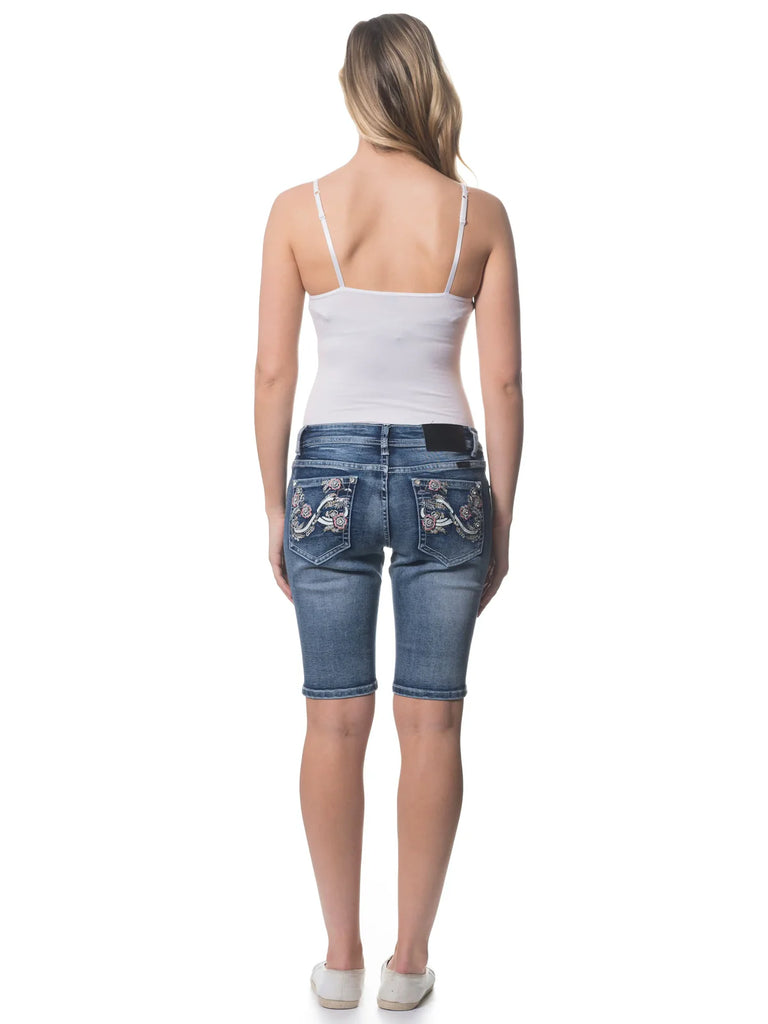 Made with our famous ultra-comfy soft denim blend, with the perfect amount of stretch to keep you on the move wherever your day takes you. Design features a romantic floral embroidery on back pocket in pink, tan and white yarn. Simple, unadorned front. White double-stitched seams.