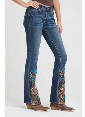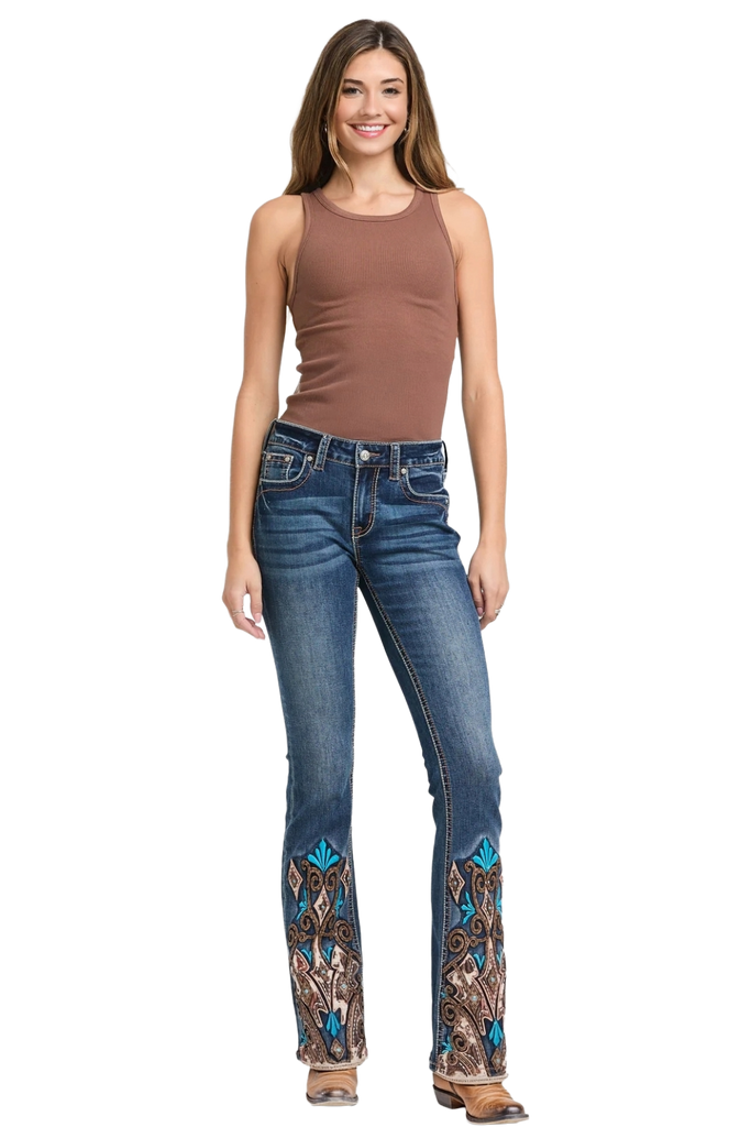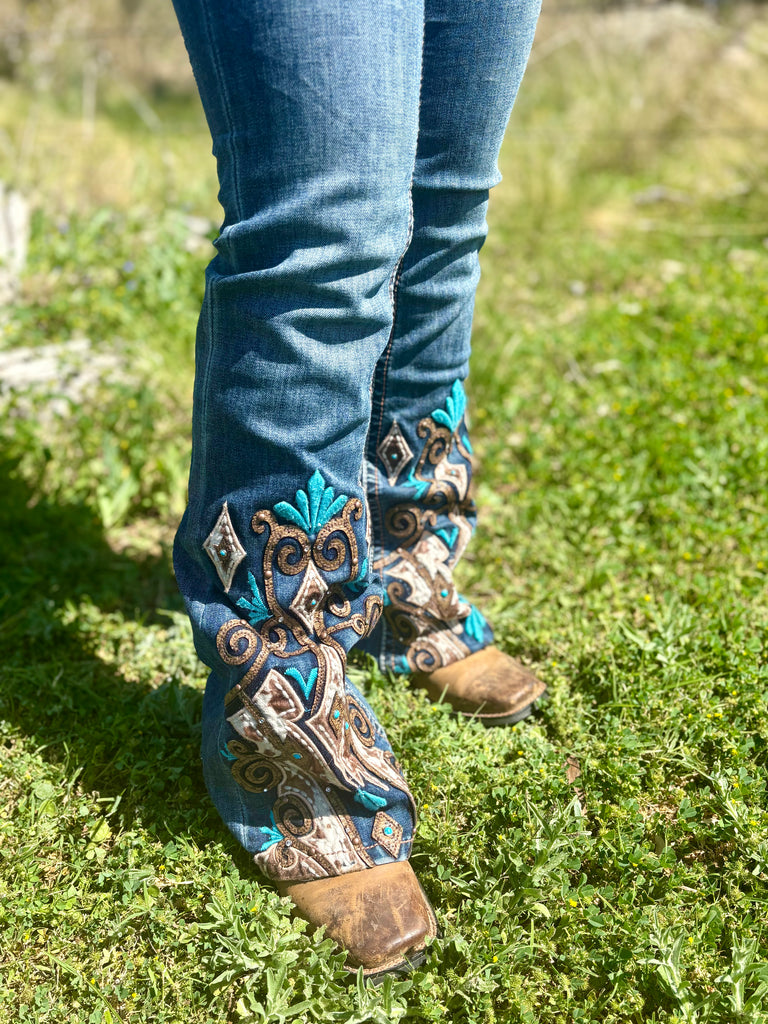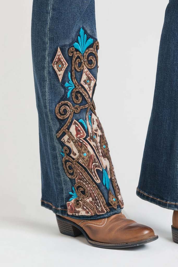 These new Grace In La Jeans are something special with a gorgeous western design on the bottom of the leg and back pockets. Featuring heavy embroidery, turquoise stone studs, faux hair on hide, crystal and copper studs and leather patch detailing. All on Grace In La's most comfortable denim in a medium wash. These jeans are absolutely one of a kind!